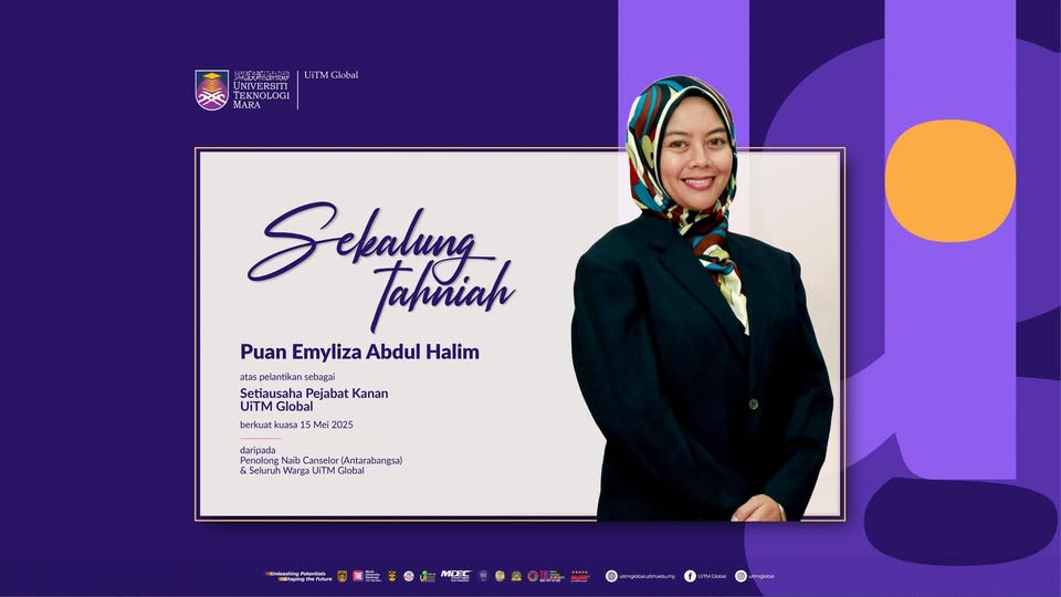 Heartiest Congratulations to Mrs. Emyliza Abdul Halim for appointment as Senior Office Secretary effective 15 May 2025 from all UiTM Global Citizens.