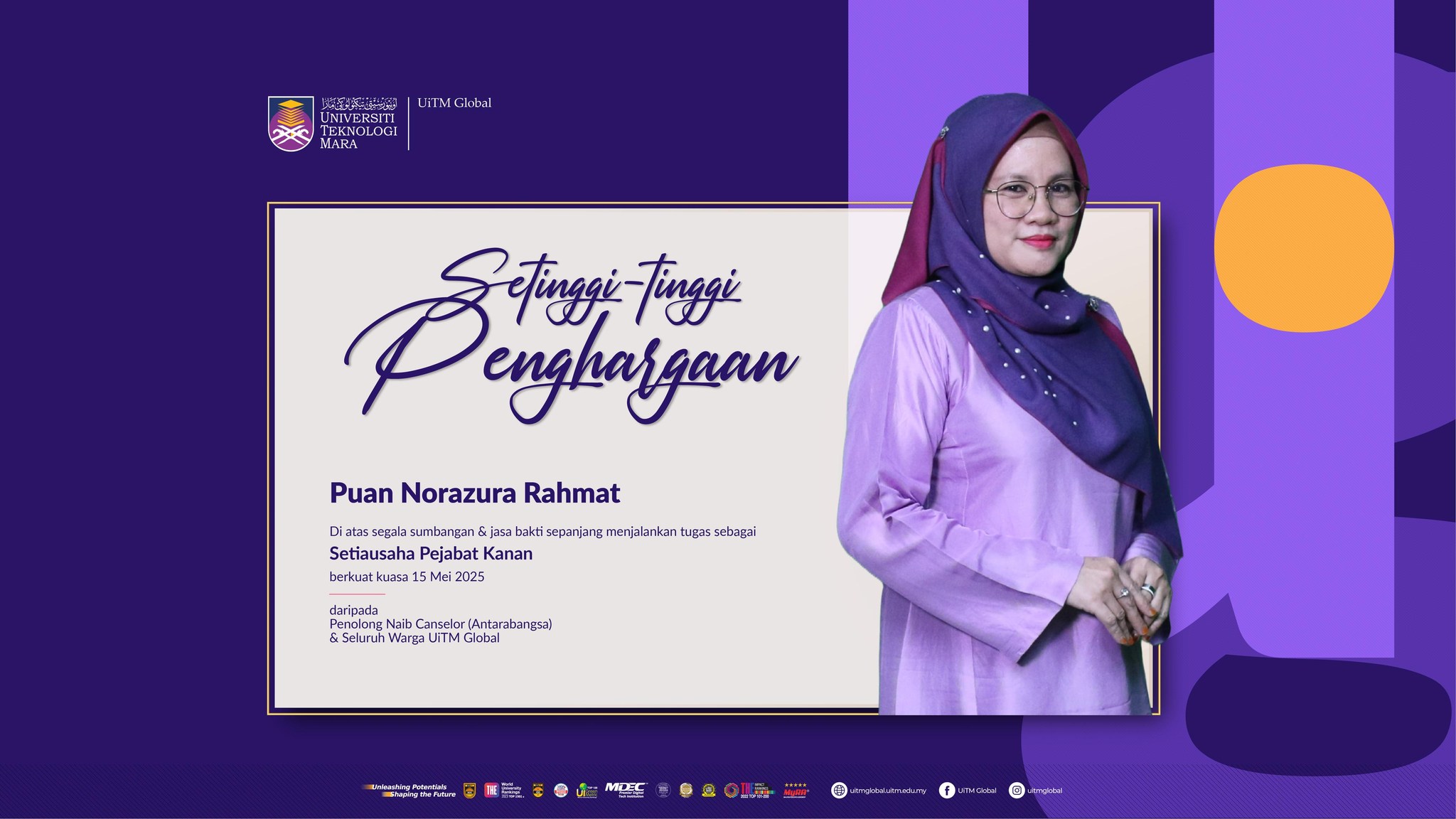 Heartfelt appreciation and thanks to Mrs. Norazura Rahmat for all her contributions and devotional services throughout her duty as Senior Office Secretary from all UiTM Global Citizens.